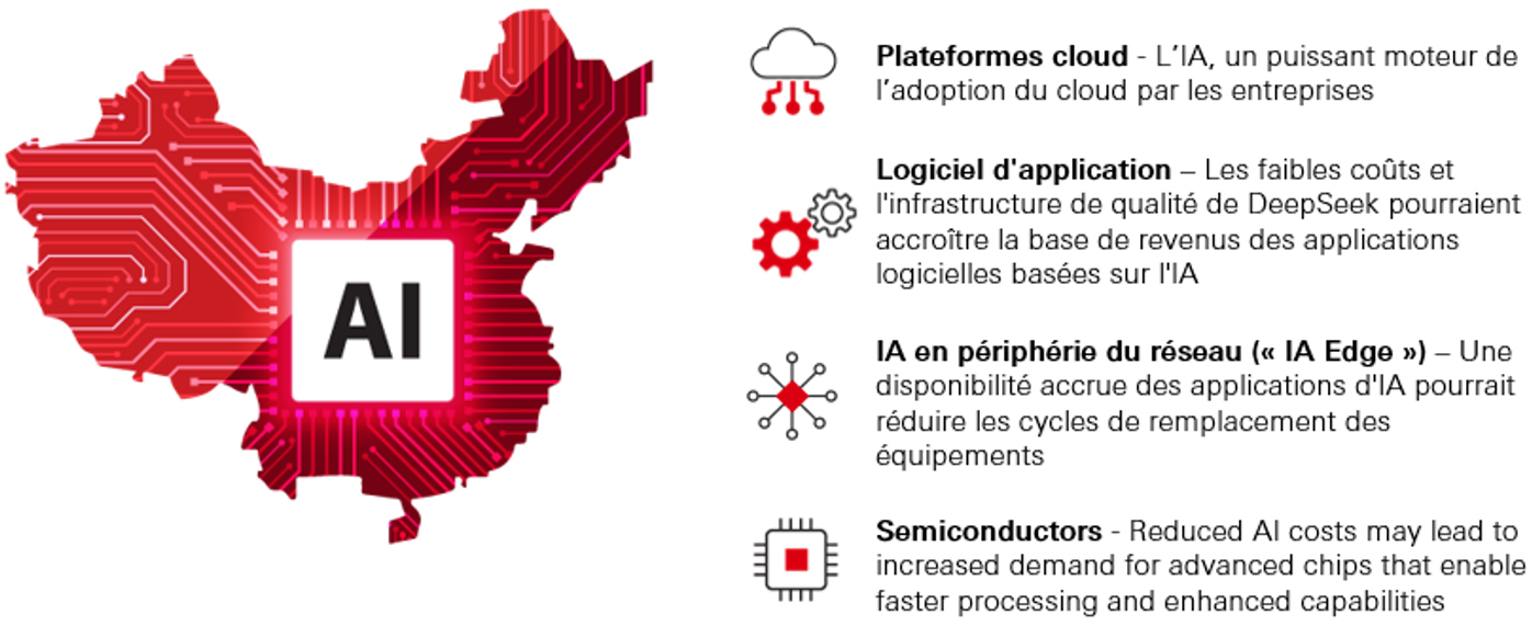 Le développement de l’IA en Chine, y compris le lancement de DeepSeek, illustre la capacité d'innovation de la Chine. DeepSeek a démontré que ses performances étaient comparables à celles des grands modèles linguistiques existants, mais à des coûts nettement inférieurs. Cette tendance pourrait accélérer l’adoption de l’IA en Chine et engendrer des gains de productivité et de nouveaux moteurs de croissance. Malgré la volatilité des marchés mondiaux, les progrès réalisés par la Chine en matière d’IA auront des répercussions à plus long terme sur les bénéfices, les valorisations et les fondamentaux des entreprises chinoises.
