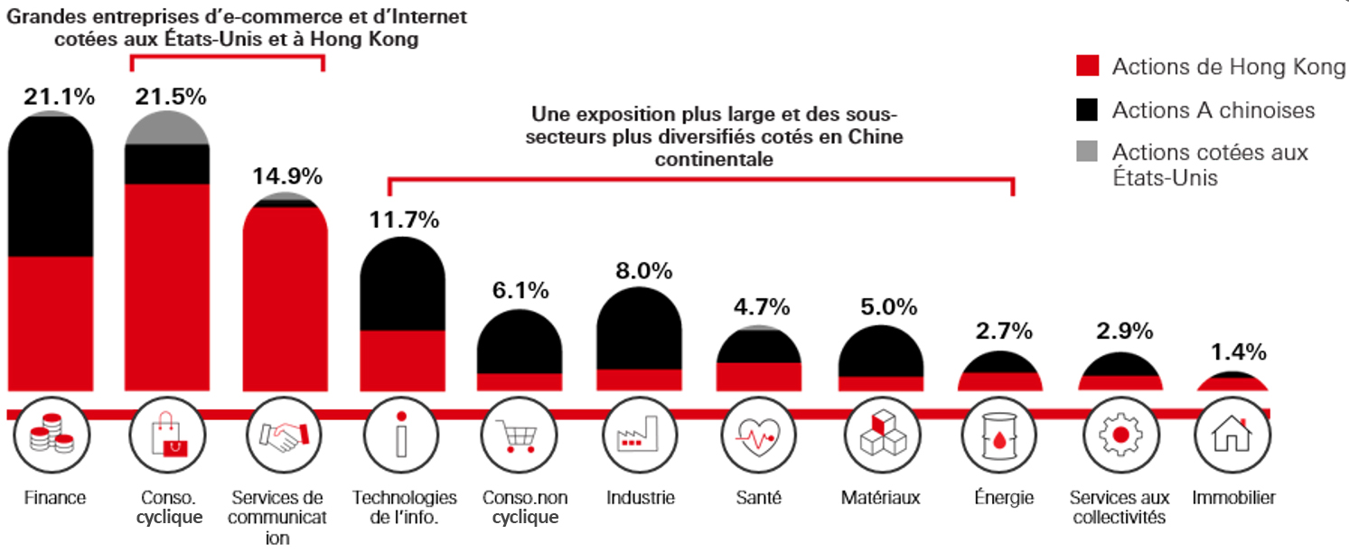 En général, les grandes entreprises de commerce électronique et d'Internet sont cotées aux États-Unis et à Hong Kong, tandis que les entreprises onshore cotées en Chine appartiennent souvent à des sous-secteurs plus diversifiés, offrant ainsi une exposition plus large. Une approche « All China » permet de saisir les opportunités offertes par les différentes places de cotation : les actions A chinoises(« China A-shares »), les entreprises chinoises cotées à Hong Kong et celles cotées aux États-Unis.