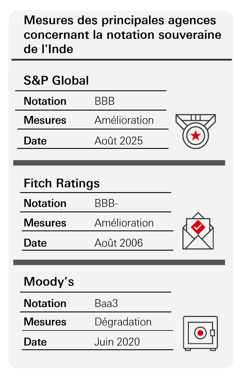 La notation souveraine de l’Inde a récemment été relevée par S&P Global de BBB- à BBB. Le passage à un rang plus élevé dans la catégorie investment grade permet à l'Inde d'accéder à des réserves plus importantes de capitaux au niveau mondial, de voir sa prime de risque abaissée et de bénéficier d’une réduction de ses coûts de financement tant au niveau souverain qu'au niveau des entreprises. Les obligations indiennes offrent déjà l'un des rendements les plus élevés de la catégorie investment grade et peuvent potentiellement améliorer le rendement d'un portefeuille d'obligations mondiales.
