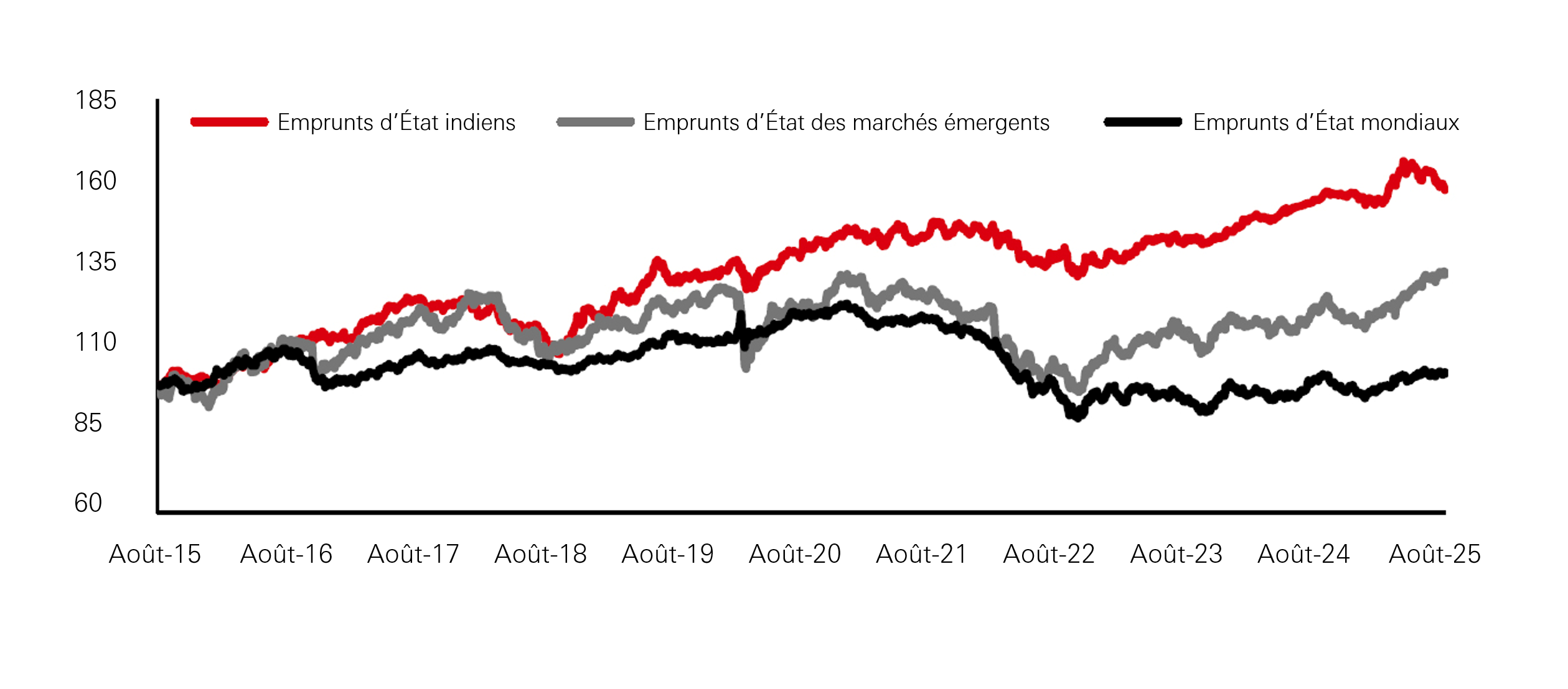 L’ajout d’obligations indiennes à un portefeuille d’obligations mondiales pourrait potentiellement accroitre la diversification et améliorer les performances. Au cours des 10 dernières années, les obligations d’État indiennes ont nettement surperformé les obligations d’État mondiales et des marchés émergents. La corrélation entre les obligations indiennes et les obligations mondiales a également été faible, à seulement 0,15 au cours des 10 dernières années,3 ce qui renforce les arguments en faveur des obligations indiennes en tant que source de diversification, en particulier dans le contexte actuel d’incertitude mondiale.