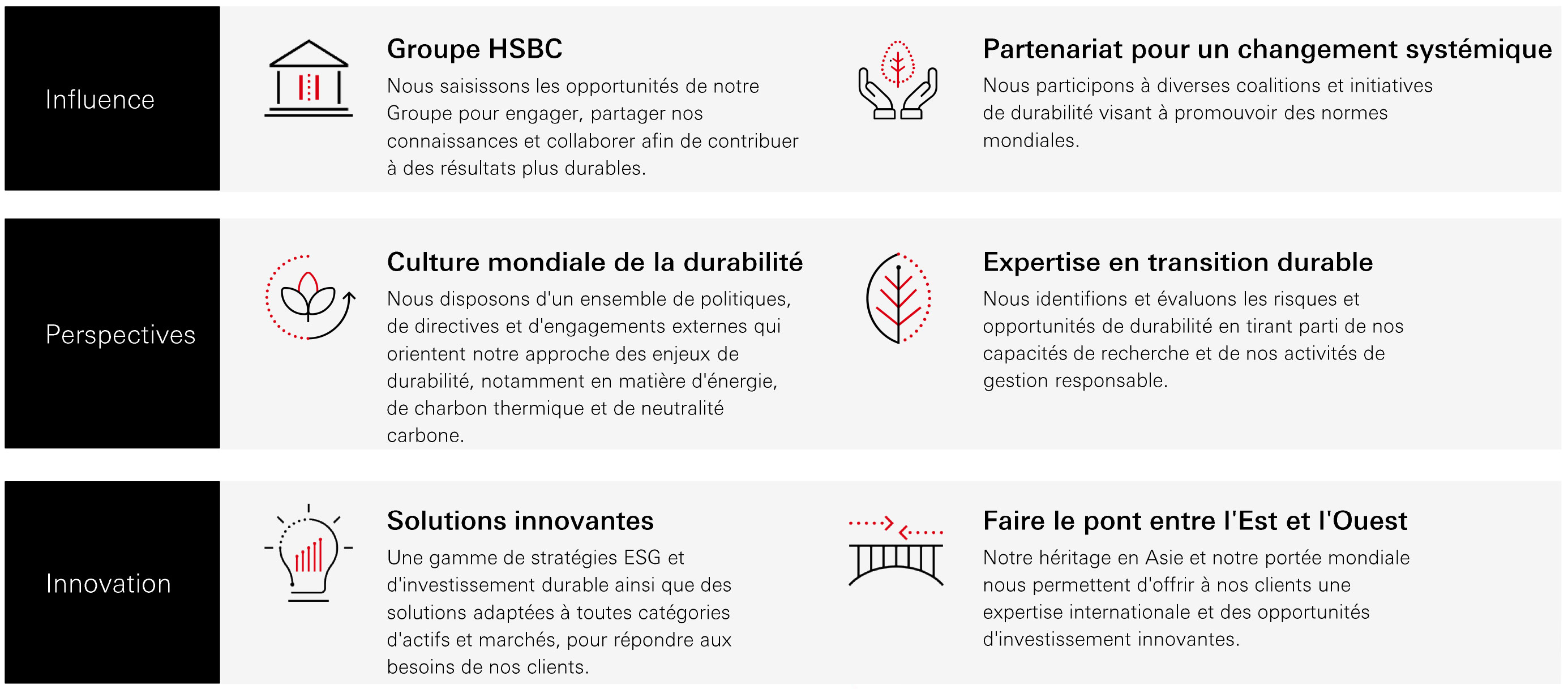 Les informations présentées concernent les encours globaux et la politique globale de HSBC Global Asset Management (France). Même si HSBC Global Asset Management (France) participe à l’implémentation et applique les politiques globales du Groupe, nous attirons votre attention sur le fait que les chiffres présentés et les engagements indiqués ne sont pas nécessairement directement liés à HSBC Global Asset Management (France) en France.