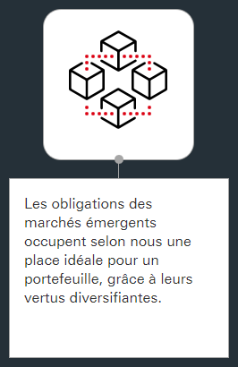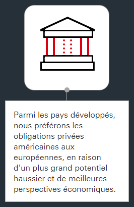 Parmi les pays développés, nous préférons les obligations privées américaines aux européennes, en raison d'un plus grand potentiel haussier et de meilleures perspectives économiques. Les obligations des marchés émergents occupent selon nous une place idéale pour un portefeuille, grâce à leurs vertus diversifiantes. Leurs intérêts plus élevés, conjugués au potentiel d’appréciation des prix, sont intéressants.