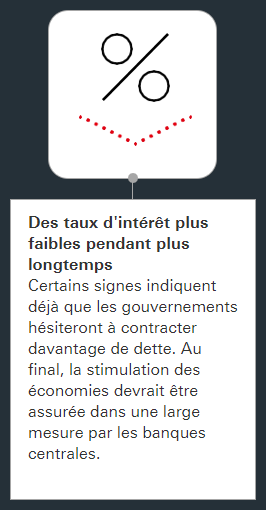 Les autorités publiques devraient maintenir les mesures de soutien, mais certains signes indiquent déjà que les gouvernements hésiteront à contracter davantage de dette. Au final, la stimulation des économies devrait être assurée dans une large mesure par les banques centrales. Autrement dit, les taux d'intérêt pourraient rester ancrés à des niveaux faibles dans un avenir prévisible.