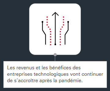 Leurs perspectives à long terme demeurent intactes. Selon toute probabilité, les sociétés technologiques bénéficieront tout autant que les autres de la reprise économique. S'il est vrai que certaines activités en lien avec le télétravail verront peut-être leur avance se réduire après la pandémie, la plupart des groupes technologiques à qui bénéficient les confinements et les mesures de distanciation sociale devraient continuer d’accroître leurs revenus et leurs bénéfices. La tendance de la dématérialisation est bien partie pour durer.