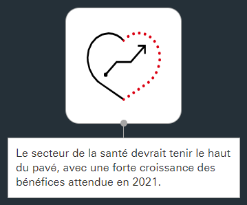 De la même façon, le secteur de la santé, d'une importance capitale dans cette crise sanitaire, devrait continuer de dominer le marché grâce à de solides anticipations de croissance des bénéfices pour 2021. Nous privilégions les entreprises dotées de ressources de recherche et développement bien établies, ainsi que celles qui sont à la pointe de l’innovation.