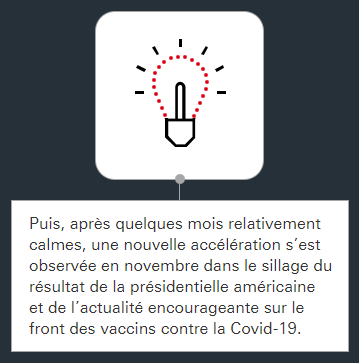 Puis, après quelques mois relativement calmes, une nouvelle accélération s’est observée en novembre dans le sillage du résultat de la présidentielle américaine et de l’actualité encourageante sur le front des vaccins contre la Covid-19.